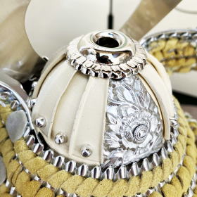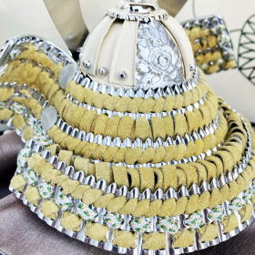 プレスで型抜きした抜き鉢ではなく、数十枚もの金属板を加工して手作業で鋲打ち止めて鉢を形成する重鉢(合せ鉢)で作られた兜鉢や、丁寧に銀鍍金を施した真鍮製の鍬形を使用しております。