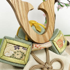 天然木目が綺麗な存在感のある鍬形や、綺麗な萌葱色の西陣織金襴を使用した吹き返しや錣(しころ)が特徴的で色彩が豊かな兜です。