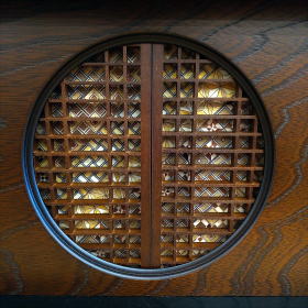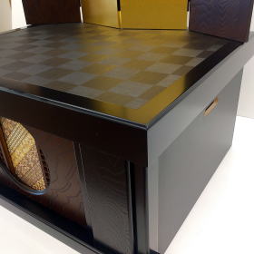 収納台は、落ち着きのある黒色と濃茶色のツートンカラーで配色し開閉式の格子を付け「寄木細工」をあしらった豪華な作りになっております。