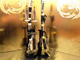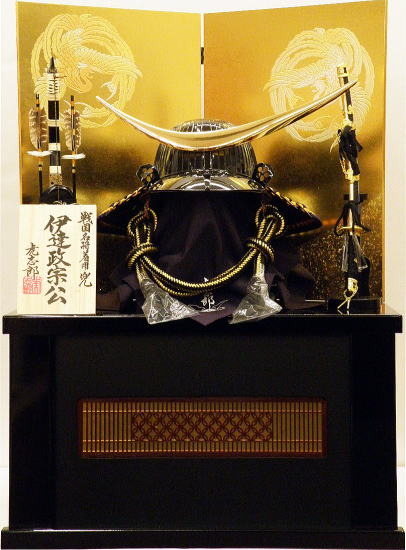 縁起の良い「鳳凰」を描いた豪華な金屏風に、存在感のある弦月前立てが際立つ漆黒色の伊達政宗着用兜が良く映えます。