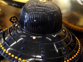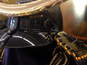厚みのある真鍮を使用し丁寧に金鍍金された存在感のある弦月前立と兜の整備の簡易・便利性や防御力と生産力を向上させる為に考案された大型の金属板=伊予小札を正絹紺糸で吊り造られた素懸(すがけ)威が特徴的で存在感のある豪華な兜です。