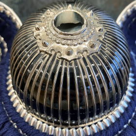 甲冑師「啓山」作、13号燻し銀仕立て伊達政宗之兜の収納飾りセットでございます。