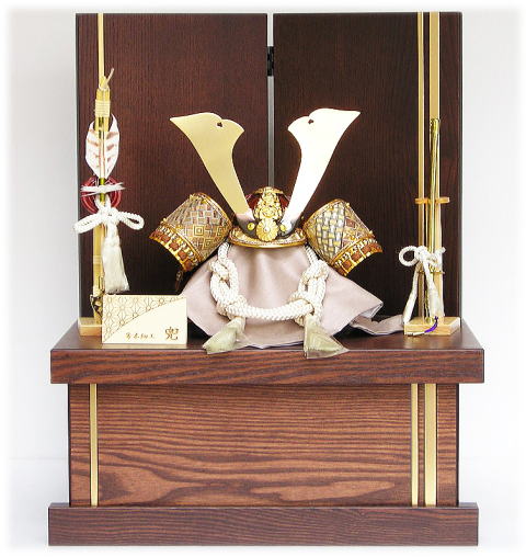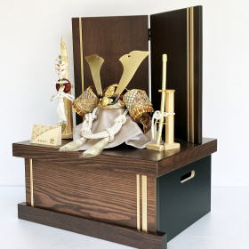 色の深さが異なる美しい天然木目が特徴で狂いが生じ難い硬材として有名な「タモ材」を突板加工し、落ち着きのある色調で重厚感のある焦げ茶色=ウォールナット調に塗装をして仕上げた収納台・屏風です。天然木目が綺麗な「タモ材」を使用したシンプルデザインの収納台・屏風に、日本の伝統工芸品の指定を受け緻密な美術品として人々を魅了する「寄木細工」をあしらった兜が良く映える当店オリジナル収納セットでございます。