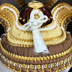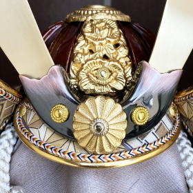 プレスで型抜きした抜き鉢ではなく、数十枚もの金属板を加工して手作業で鋲を止めて鉢を形成する重鉢(合せ鉢)で作られた兜鉢や、本金を溶かし塗り仕上げる本金鍍金を施した真鍮製の重厚な鍬形、茶系色を基調としたグラデーション配色の綺麗な正絹段威が特徴的で色彩や素材にこだわり作られております。