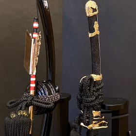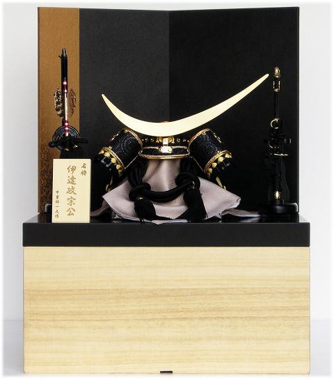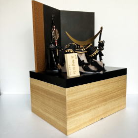 天然木の温もりを感じさせる白木収納台と優美な紙肌が特徴的な雲肌紙屏風を合わせたモダンなデザインの収納台・屏風に、黒一色の配色の中に存在感のある三日月の前立てが際立つ伊達政宗兜が良く映える当店オリジナル収納セットでございます。