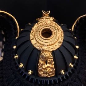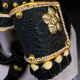 煙りで燻すことでなめし・色付けした革に様々な絵柄を型取り漆を刷り込んで造る高価な「印伝革」を贅沢に使用した吹き返しとあえて黒一色で仕上げたシックな配色の正絹威しが特徴的で色彩や素材にこだわり作られた兜です。