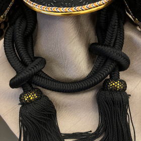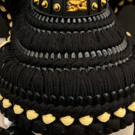 プレスで型抜きした抜き鉢ではなく、数十枚もの金属板を加工して手作業で鋲を止めて鉢を形成する重鉢(合せ鉢)で作られた艶消し色の兜鉢や、生命力に溢れ不老不死の力を宿すといわれる三日月がモチーフに戦に常勝して命を繋ぐ=家系を絶やさないという強い意志を表現した鍬形(前立て)と言われる三日月型の鍬形も特徴的で力強さが感じられます。