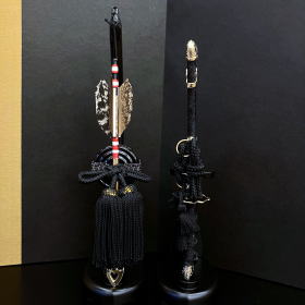 ※「印伝革」とは、なめした革を黒・紺・茶・エンジ等様々な色合いに染色し、裁断したあと型紙(和紙)を置き、上から付けして作られます。数日間陰室で乾燥させ完成した印伝革は、強く・柔らかく・軽い革と時とともに色が冴える漆との調和で独特の風合いを出す伝統的工芸品でございます。