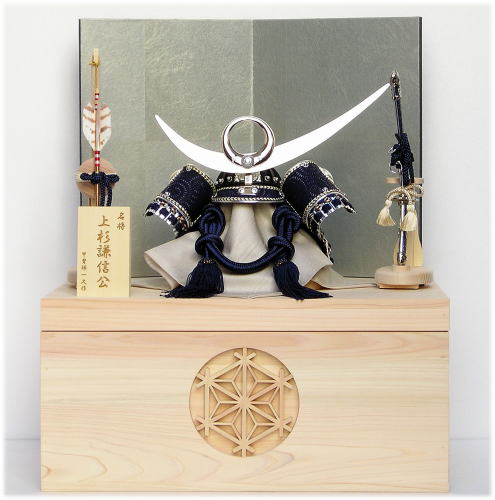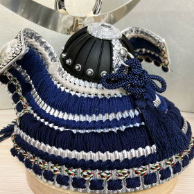 日本の伝統工芸のひとつ「印伝革」を兜の吹き返しに用いた甲冑師「一久」作、8号上杉謙信兜でございます。