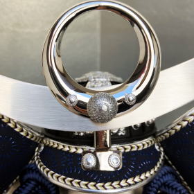 プレスで型抜きした抜き鉢ではなく、数十枚もの金属板を加工して手作業で鋲を止めて鉢を形成する重鉢(合せ鉢)で作られた兜鉢や、丁寧に銀鍍金を施した真鍮製の前立てを使用しており高級感漂います。