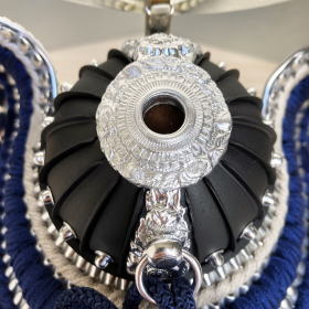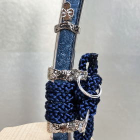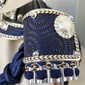 煙りで燻すことでなめし・色付けした革に様々な絵柄を型取り漆を刷り込んで造る高価な「印伝革」を贅沢に使用した吹き返しと青・白色を基調とした綺麗な正絹中白威しが特徴的で色彩や素材にこだわり作られた豪華な兜です。
