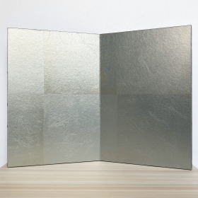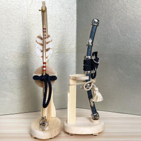 森林伐採の環境保全を目的にSGEC森林認証を受け、東京オリンピックの認定材として国立競技場の設営にも使用され安定した強度と美しい木目が特徴の鹿沼産桧材で作られた収納箱に長い歴史を持ち鹿沼を代表する伝統工芸品「鹿沼組子」をはめ込み仕上げた収納箱に、錫(すず)箔を絹オーガンジーで包み貼り薄青色を着色することで箔の質感を活かし仕上げた綺麗な屏風を合わせました。