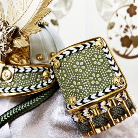 煙りで燻すことでなめし・色付けした革に様々な絵柄を型取り漆を刷り込んで造る高価な「印伝革」を使用した吹き返しと緑系色を基調とした綺麗な配色の正絹威しが特徴的で色彩や素材にこだわり作られた兜です。