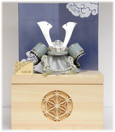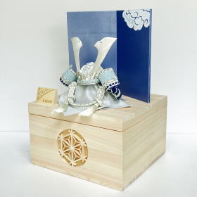 綺麗な青色のオーガンジー紙に古くから良い事が起こる兆しとして縁起の良い「瑞雲」の吉祥文様を手描きした上品な屏風を合わせました。天然木の温もりを感じられる収納台に、独特の模様を手刺しした刺繍が特徴的な「こぎん刺し」を使用した兜を合わせた兜収納セットでございます。兜・屏風は下部の台に収納できます。