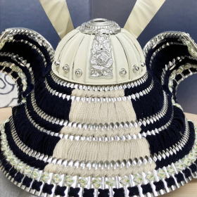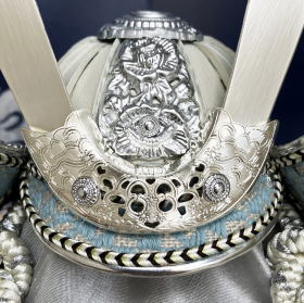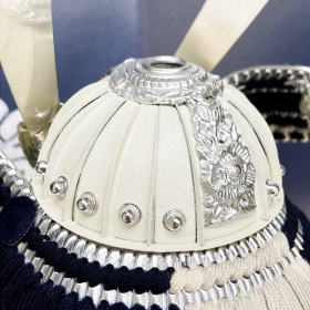 白色に鍍金した兜鉢に青系色の綺麗な威など、7号サイズのコンパクトな兜ですが色彩や素材にこだわり作られた綺麗な兜です。