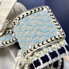 生成色の麻生地に青色の木綿糸で刺繍した「こぎん刺し」を使用した眉差・吹き返しと別名「勝ち草」と称し縁起の良い「沢潟」(おもだか)形に3mmと小ピッチ(間隔)で糸を編み込み仕上げた綺麗な沢瀉威しが特徴的な兜で、青森県の伝統工芸として有名な刺繍細工・津軽「こぎん刺し」と甲冑をコラボレーションさせた当店オリジナルの兜でございます。