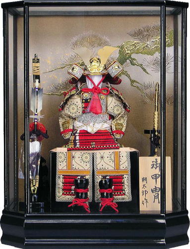 ケースは、前面の左右のガラス面を斜めにカットすることで鎧の見栄えをよくする工夫を凝らしたお洒落な六角型ガラスケースです。