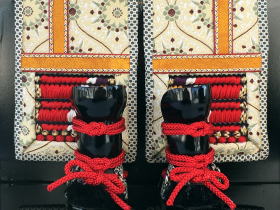 赤・白・紫・黄・緑色と多色の正絹糸を贅沢に使用し、手間を掛け複雑な配置に編み込んだ「褄取威し」が特徴的な鎧です。多色の正絹糸を巧みに使い極小間隔で幾度も糸を通し作られる為、通常の甲冑製作よりも多量の正絹糸と数倍の手間を要し仕上げられております。その仕上がりは見事で正絹糸のしっとりとした質感と美しさをご堪能頂けます。