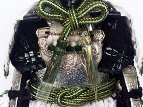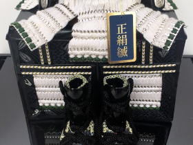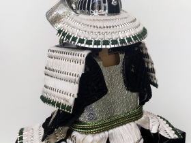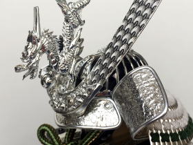 正絹白糸で綺麗に威した白糸威と丁寧に銀鍍金されたパーツや装飾金物が特徴的で白・銀色でシンプルに配色された綺麗な鎧です。登竜門の考えから立身出世の象徴と言われ縁起の良い「龍」を模った金物をあしらった龍頭付き兜が豪華で存在感があります。