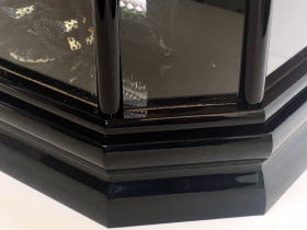 ケースは、前面の左右のガラス面を斜めにカットすることで鎧の見栄えをよくする工夫を凝らしたお洒落な六角型ガラスケースです。末代まで子孫繁栄・末長く家系が続きますようにと願いが込められた「松葉」を銀彩で描いた紫色のバックを合わせました。