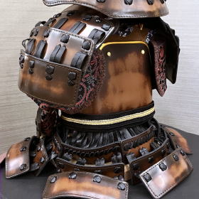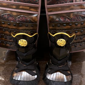 鎧全身に至り特殊な高級本牛皮(靴4足分相当)を贅沢に使用し、甲冑の整備の簡易・便利性や防御力と生産力をより向上させる為に考案された大型小札=伊予小札を正絹糸で吊りながら形作る素懸(すがけ)威しと、天下分け目の戦いを征した勝利を呼ぶ兜として徳川家に代々受け継がれてきた大黒頭巾型の兜が特徴の高級感漂う重厚な鎧です。