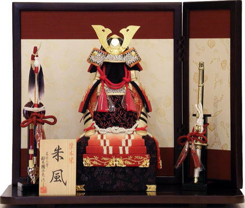 「鈴木國与志」作、甲州印伝革を使用した木目込鎧「朱風」でございます。