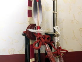 ※「トンボ」は、害虫を食べ駆除する事から勝虫(かちむし)とも呼ばれ、昔から縁起の良い虫とされています。またトンボは前へ前へ飛び、後ろに下がらないことからも勇猛果敢で勝負強い虫として勝利を呼ぶ虫と言われ、兜の前立てや武具に用いられました。
