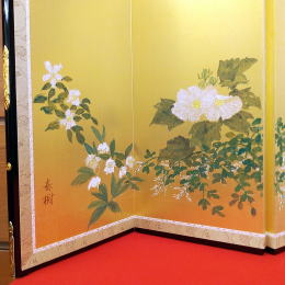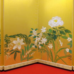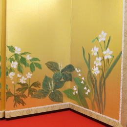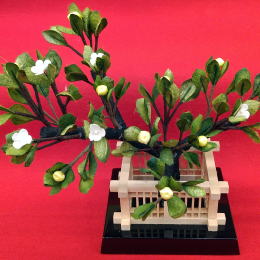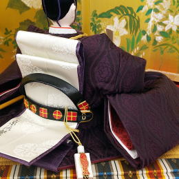| 正絹泥染め衣装5人飾りです。、京雛作家「京洛紫雲」が製作しました。 奄美大島の染め物である「正絹 泥染め」をお衣装に使用しております。 泥染めは、3世代先まで色がもつと言われており、退色しにくいのが特徴です。 反物を泥の中に入れて、泥中の成分であるタンニンと色素を結合させて染めます。 その結合がとても硬いので、色もちが良いと言われております。 正絹ならではの光沢感と、泥染めならではの黒みを帯びた色合いがとても綺麗です。 お屏風は、日本画家が手描きで15種類の花を入れました。ベースには、金沢箔の上からシルクを掛けたものを使用しております。お子様への願いを込めて、丁寧に描かれた15種類のお花には、それぞれ素敵な花言葉がございます。 ????????????????????????????????????????????????? 右から @水仙:「尊敬」 A鈴蘭:「幸福の再来」 B二人静:「いつまでも一緒に」 C二輪草:「友情・協力」 D白山吹:「気品」「崇高」 E白牡丹:「風格」 F姫著莪:「決心」 G白鉄線:「高潔」 H卯の花:「古風」「風情」「乙女の香り」 I山百合:「荘厳」「高貴な品性」 J甘野老:「元気を出して」「心の痛みが分かる人」 K白芙蓉:「繊細な美」 L白萩:「思案」「想い」 Mクリスマスローズ:「追憶」※花が落ちないことから「受験生にエールを送る花」ともいわれます。 N山茶花:「困難に打ち勝つ」「ひたむき」 ????????????????????????????????????????????????? お道具は、唐草文様が入ったものを合わせております。 唐草は、縦横無尽にぐんぐん育つことから、生命力・繁栄の象徴とされております。 途切れることのない連続した柄配置は、吉祥文様とされ、縁起が良いです。 お雪洞は、墨絵で描いた桜を転写しております。 コードレス(電池式)で灯りが点きます。 桜橘は、繭玉を染めて切り取ったものを使用しております。 繭玉特有の表面の毛羽立ちとマットな質感が楽しめます。 毛氈は2mm厚の地厚のしっかりとした毛氈を使用しております。(毛氈の下には桐製の土台が付きます。) ●こちらの商品の特典(サービス品) ・サービス品@赤色の毛氈(もうせん) ・サービス品Aお手入れセット ・サービス品Bお節句説明書 ・サービス品Cお子様のお名前入り立札 ・サービス品Dお被布(お子様に着せて頂くと可愛いです) ・国内送料無料です(海外への送料につきましては有料になります) |