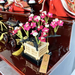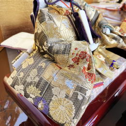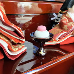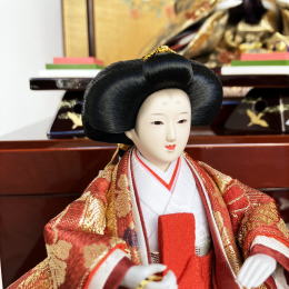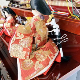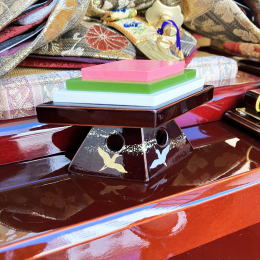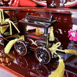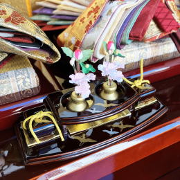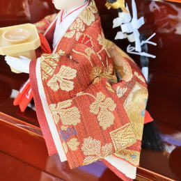 コンパクトサイズですが、艶のある塗り物のお飾り台、華やかな西陣織衣装、