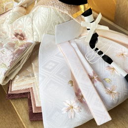 優しい色合いで桜の刺繍を入れ、その刺繍の色味に合わせて袴や重ねも淡い紫やピンクでまとめました。