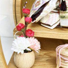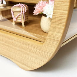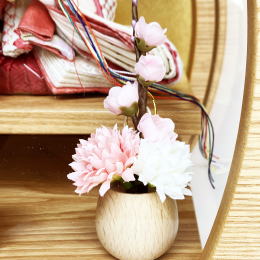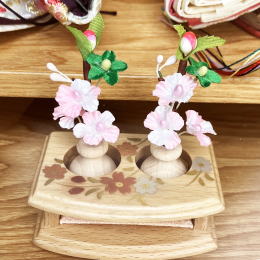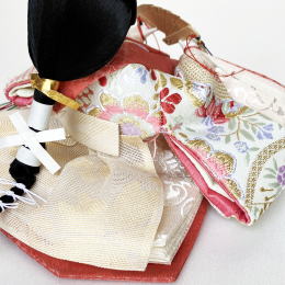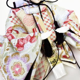 | コロンとした丸型の木目ケース飾りです。 コンパクトなサイズの為、飾る場所を選びません。 お人形は、伝統工芸士「小野島久佳」作です。 親王様のお衣装は、西陣織金襴を使用しております。 前飾りの貝桶や三宝、お雪洞にも桜の蒔絵が入った桜尽くしのお飾りです。 桜は、まだ寒く葉もない時期に花を沢山咲かせることから、生命力の象徴、成功の象徴とされております。 ケース後方下からお雪洞のコードが出ます。 アクリルケースなので軽く、割れないようになっております。 ケース飾りですが、お人形のみ接着されておりません。 ケースの後ろが開閉式になっており、お人形を手に取って頂けます。 是非、お子様と一緒にお飾りも楽しんで下さい。 ※お人形のみ接着されておりませんが、他のものは全て接着されており動かないようになっております。 ※「金襴」とは糸に金箔を巻きつけた金糸や、細く切った金箔を織り込み、紋様を顕わした布地のことを言います。 織物の中でも特に豪華で黄金色に輝く豪奢な文様は数ある布地の中でも最高の位に入る織物です。 京都西陣で織られるようになったのは、江戸時代、文禄元年(1592年)からであり、 多くの職人によって改良が続けられ現在の「西陣織金襴」に至っております。 ●こちらの商品の特典(サービス品) ・サービス品@赤色の毛氈(もうせん) ・サービス品Aお手入れセット ・サービス品Bお節句説明書 ・サービス品Cお子様のお名前入り立札 ・サービス品Dお被布(お子様に着せて頂くと可愛いです) ・国内送料無料です(こちらの商品は海外への発送はできません) |