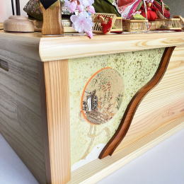 | 京刺繍手描き金彩衣装親王飾りです。 華やかな桜刺繍の縁を手描き金彩で囲い仕上げた美しいお衣装です。 桜は、葉が揃う前に満開のお花を咲かせることから成功・生命力の象徴とされております。 お衣装に合わせてお飾り台やお屏風にも美しい金彩蒔絵を入れております。 お飾り台やお屏風枠には、静岡県産の天竜杉を使用しております。 温かみがありほっこりと優しい印象です。 お飾り台の前面は手前から白い木目、濃い木目、金彩蒔絵と3段になっており、奥行きを付けたデザインが素敵です。 お道具には、蓋つきの可愛い落雁のセットをご用意しました。 竹細工でできた入れ物が可愛らしく、蓋を開けたり閉めたりと楽しめる、女の子が喜びそうなお飾りです。 お雪洞はコードレス(電池式)で灯りが点きます。 ●こちらの商品の特典(サービス品) ・サービス品@赤色の毛氈(もうせん) ・サービス品Aお手入れセット ・サービス品Bお節句説明書 ・サービス品Cお子様のお名前入り立札 ・サービス品Dお被布(お子様に着せて頂くと可愛いです) ・国内送料無料です(海外への送料につきましては有料になります) |