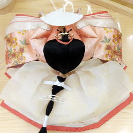 お姫様の裳袴(後ろ側のマントのような部分)にも金色で桜の柄を入れております。透けた紗の素材にさりげなく入った桜がまた可愛いです。