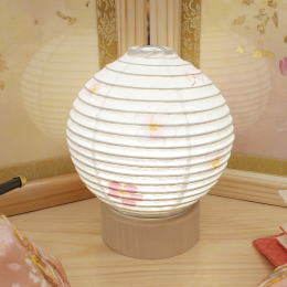 丸い形のお雪洞は、コードレスで灯りが点きます。灯りを点けると光がお屏風に反射して更に華やかで美しいです。
