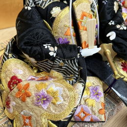どっしり重厚感のあるお衣装に合わせて、お顔は古典的な表情のものを合わせました。お姫様の髪飾りは、華やかなお衣装の雰囲気に合わせて細めの金糸を使用しております。