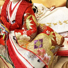 吉祥紋である青海波の金彩をベースに、大きな梅花を金糸でつくり、その中に桜や梅花などの刺繍を入れた大変華やかなお衣装です。