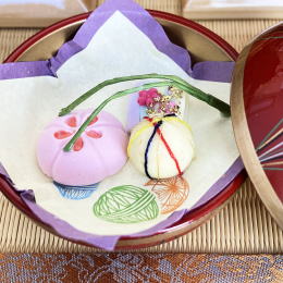 お道具は、蓋の開け閉めができる塗り物のまりの容器に入った和菓子のセットを、