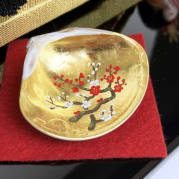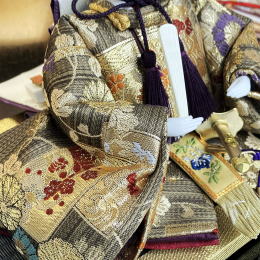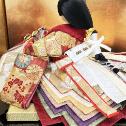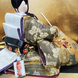 | 草木染め西陣織衣装親王飾りです。 草木染めの糸を使用して織り上げた西陣織衣装です。 落ちついたトーンの中に金糸が光り、派手になりすぎない、落ちついた華やかさのあるお衣装です。 松に八重菊という縁起の良い柄が入っております。 松は常に青いことから生命力の象徴とされ、菊は昔お薬として使用されていたことから不老長寿の意味をもちます。 お道具には、蛤の貝合わせをご用意しました。 貝の内側を胡粉で均し、その上から置き上げという技法で胡粉で模様を盛り上げ金箔を貼り、手描きで梅の絵を入れた大変手間の掛かる一品です。 桜橘は、正絹繭玉を染め上げ、葉や花の形に整えて作った上質なものを合わせております。 親王様が座る畳台には、珍しい墨色の畳と縁には佐賀錦を使用しました。 加賀蒔絵入りのお屏風が全体を更に華やかに演出し、優美な雰囲気です。 ●こちらの商品の特典(サービス品) ・サービス品@毛氈(もうせん) ・サービス品Aお手入れセット ・サービス品Bお節句説明書 ・サービス品Cお子様のお名前入り立札 ・サービス品Dお被布(お子様に着せて頂くと可愛いです) ・国内送料無料です(海外への送料につきましては有料になります) |