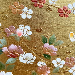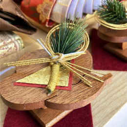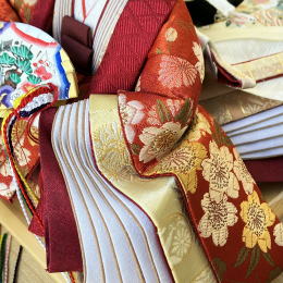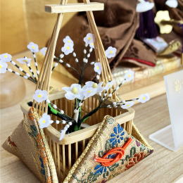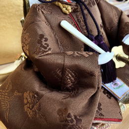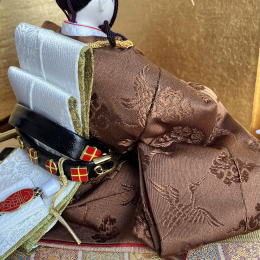 お殿様は、おめでたいことの前兆とされる縁起の良い雲「瑞雲」と長寿の象徴「鶴」の柄を織り込んだ正絹衣装です。お姫様は、繁栄・豊かさを意味する「桜」柄の西陣織金襴衣装です。薄茶色の縁取りを施した白重ねで合わせました。節句人形工芸士「博暁」作の上品な仕立てになっております。 |