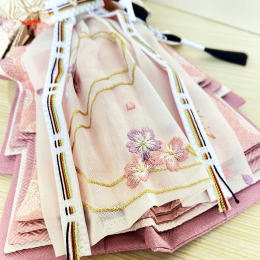 お屏風やお道具、お雪洞にもお衣装と合わせて桜の刺繍が入っております。桜尽くしのお飾りです。