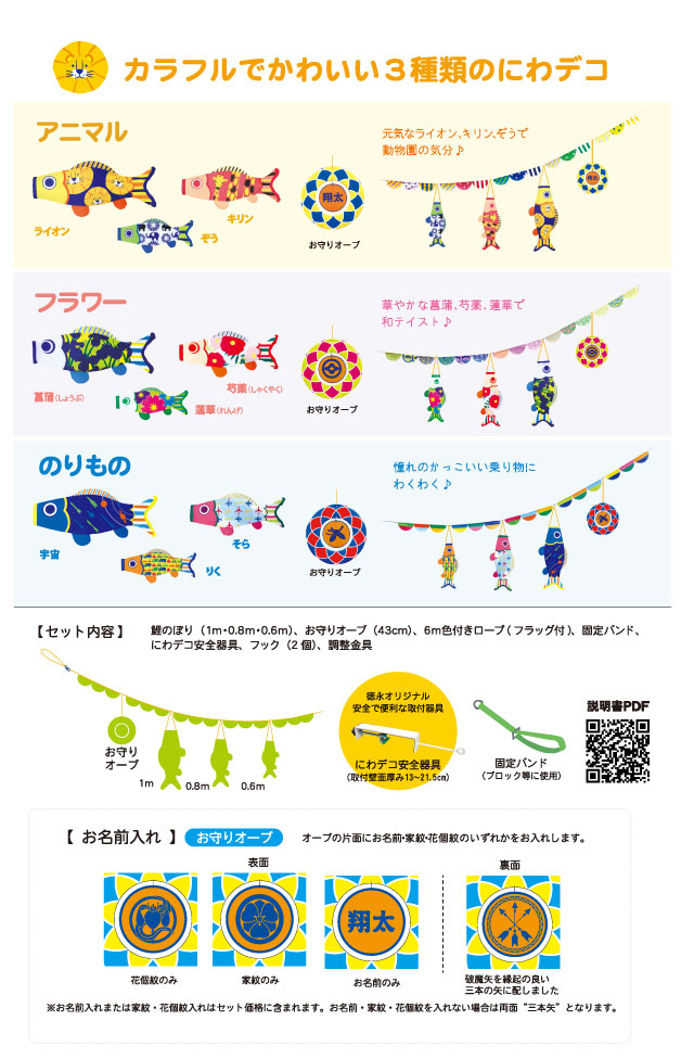 セット内容:鯉のぼり(1m・0.8m・0.6m)、お守りおーブ(43cm)、6m色付きロープ(フラッグ付)、固定バンド、ベランダ取付器具、フック(2個)、調整金具 |