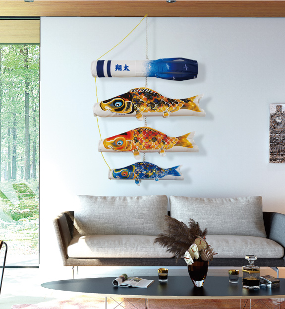 錦鯉独特の色合いを、七色にぼかし手染めの友禅の技法で仕上げました。 飾り台には黒色の木製台を使用し、どんなお部屋でも設置でき、どんなお部屋の雰囲気にも合います。 『浮き浮き飾り』と『吊るし飾り』は、お部屋のスペースに合わせてお飾りいただけます。