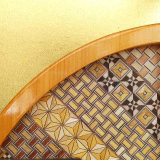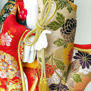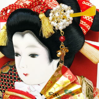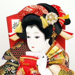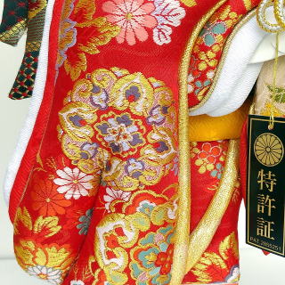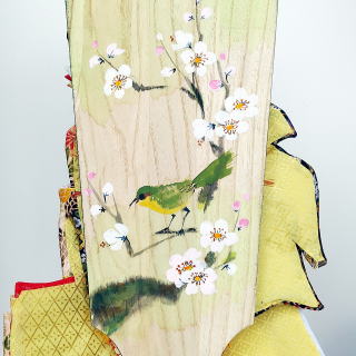 | 立体的でボリュームのある押絵が特徴の羽子板です。 厚みのある西陣織金襴を2種類使用しました。 ベージュ色の金襴は、地紋に魔除けの意味をもつ菱形が入り、その上から菊を配置しております。菊には、不老長寿の意味がございます。 赤色の金襴は、金糸のきいた華やかな花紋と、その間に菊の花が入っております。 羽子板の裏側には、手描きで梅の花と鶯が描かれております。 梅の花は、寒い時期に花を沢山咲かせることから、生命力の象徴とされております。 裏面に描かれる絵には、桜や梅が多いですが、鶯が入っているので珍しいです。 ケースには、静岡県産の天竜桧を使用しました。 前扉を開けると、桧の良い香りがします。 ケースバックには、箱根の伝統工芸品「寄木細工」を使用しました。 色々な色の木を寄せて集め、幾何学模様を作り上げる職人技が光ります。 (金太郎飴のように、木を模様を考え束にして集めたものを、カンナでひくと薄い一枚の寄木細工が完成します。完成までにとても時間と手間がかかります。) 明るく華やかな羽子板飾りです。 ※押絵生地の柄の出方はひとつずつ異なります。 詳細画像が必要な方は、お気軽にお申し付け下さい。別途画像を送らせて頂きます。 ※サービスでお付けしております「飾り羽根」の色は随時変更しております。 画像とは別の色の「飾り羽根」をお付けする場合もございます。ご了承頂けましたら幸いです。 ご希望がある方は、お申し付け下さい。できる限りご対応させて頂きます。 ●こちらの商品の特典(サービス品) ・お子様のお名前と御生年月日入り立札 ・飾り羽根 ・飾りまりは、ケースに接着されております。 ・国内送料無料です(ガラスケースの海外への発送はできません) |