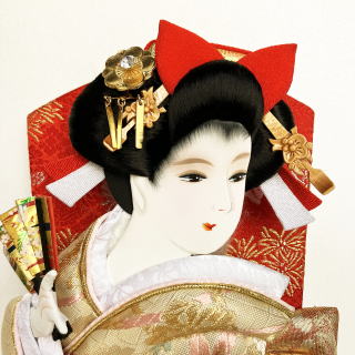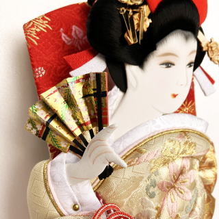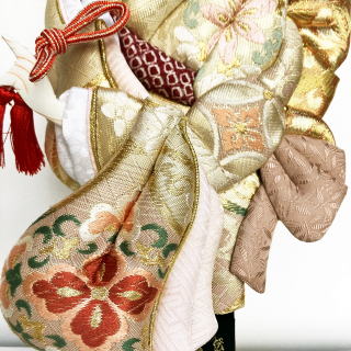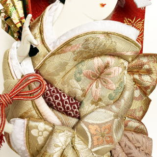 厚みのある華やかな帯地を使用した羽子板です。長寿を願う花菱の柄が入っております。 埼玉県春日部市の伝統工芸士「江戸勝」が作りました。 可愛過ぎず渋すぎずのちょうど良いお顔と、動きのある押絵(体)のつくりが良い感じです。 かんざしは本柘植(つげ)を使用しております。