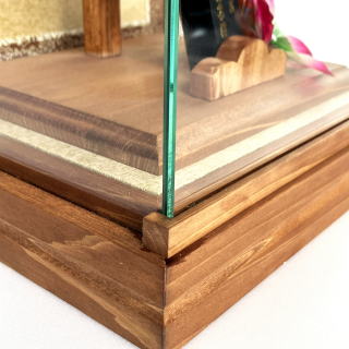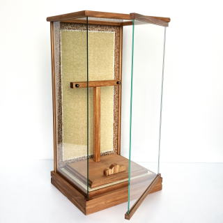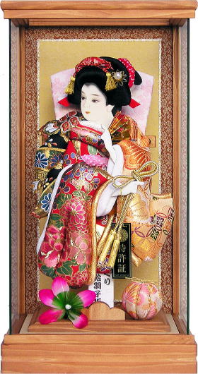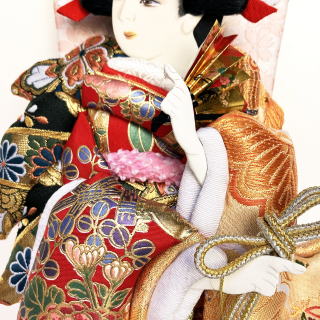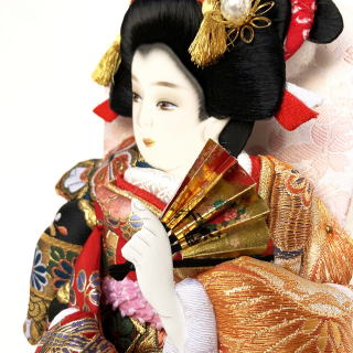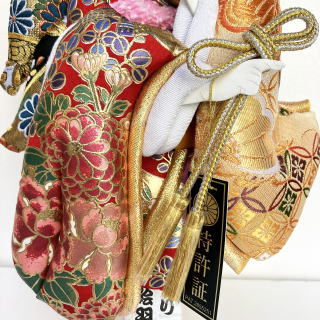肉厚で立体的な押絵が豪華な羽子板です。 不老長寿を願う菊、富貴の象徴である牡丹を大きく金彩で入れた生地は地の赤色と相まってとても華やかです。西陣織金襴には、菊と同じく不老長寿をあらわす松、円満・調和をあらわす七宝柄が入っております。こちらも大柄で存在感抜群です。 ケースはシンプルで上品なものを合わせました。 ケース枠には桧を使用し、更に柿渋塗りで仕上げております。 柿渋には防虫・防腐効果があり、また味わい深い経年変化も楽しむことができます。 (年数と共にゆっくりと、徐々に色が濃くなっていきます。) 前面の支柱がないので、斜めから見た際にも羽子板が綺麗に見えます。 コンパクトサイズですが存在感のある素敵な羽子板飾りです。 ※飾りまり・飾り羽根・お名前立札をサービスでお付けしております。 (まり・羽根の色柄は画像と異なる場合がございます。その場合、必要でしたら別途画像をお送りさせて頂くことも可能です。お気軽にお申し付け下さいませ。) |