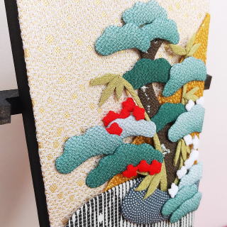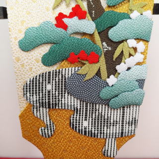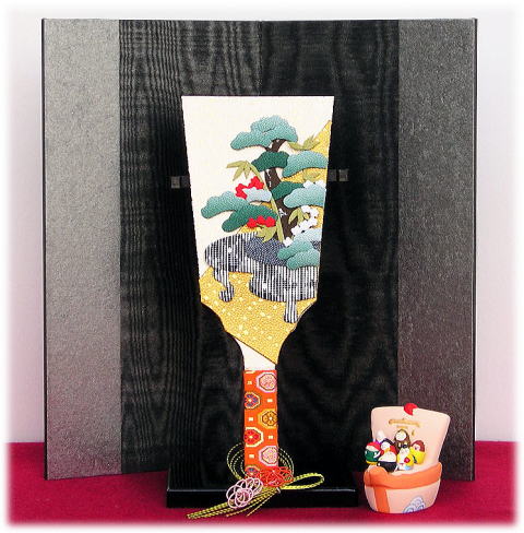 | 名古屋の作家【玉泉】作、松竹梅押絵羽子板です。 縮緬生地を使用し、細かなパーツを組み合わせて作られております。 松と竹は冬でも緑を保ち、梅は寒い季節に開花するため、どちらも縁起の良いものとされてきました。 常緑の「松」には「不老長寿」の意味があり、次々へと新芽を出して広がる「竹」には「子孫繁栄」の意味があります。 また「梅」には苔が生えるほどの樹齢になっても、他の花より先に気高い香りを伴って花を咲かせることから「気高さ」「長寿」の意があります。 羽子板の柄元には、奈良で製作した梅の水引を添え、 羽子板の横には、京都の作家【島田耕園】作の宝船を合わせました。 お屏風は静岡で製作したものです。 銀箔の上からシルクを2枚合わせて、木目のような模様を出しております。 ●こちらの商品の特典(サービス品) ・お子様のお名前と御生年月日入り立札 ・梅の水引 ・もうせん(お飾りの下に敷く布) ・国内送料無料です(ガラスケースの海外への発送はできません) |