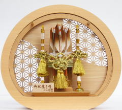 ![]() 破魔弓をお選びになる時にまず大きさです。大きさの比較は高さとなります。 破魔弓に号数がありますが、職人によってだいぶ異なりますので高さ「何cm」という比較が良いでしょう。 ![]() 地域差も多少ありますが、最近では高さ約50cm台が中間くらいの大きさとなってきております。この大きさを基準にマンションやアパート住まいのかたはもう少し小さめの30~40cm台、逆に一戸建てや場所のあるかたは60cm台、もしくはこれより大きめの70cm台、80cm台にされるかたが多いようです。 また飾る時期は約1ヶ月、しまう期間は約11ヶ月ということと、もし今後弟さんか妹さんがお産まれになられた場合、同じ位の大きさのもの、もしくはやや小さめ位のものをご用意させれることもご考慮していただく必要があるかと思います。 破魔弓のガラスケースについてですが、いろいろな色のケースがあります。 昔は黒枠が多く見られましたが、最近では桧(ひのき)や竹などの上質の木目タイプや高級な塗り物として名高い会津曙塗りタイプが人気です。お飾りになる場所も和室ではなく生活の中心でご家族が団らんするリビングをお選びになる方が多くなり木目タイプのニーズが高まってきております。どのお色が正しいということはございませんので、最終的にはお好みでお選びいただくことが一番良いです。 破魔弓の中身ですが、日本の伝統工芸「甲州印伝革」・「寄木細工」・「千筋細工」を用いて作られた日本の伝統美を感じさせる破魔弓飾りが人気です。 基本的には東西南北の魔を除ける四本の矢を弓があれば良いとされております。 四本矢以外に五本矢、六本矢など数多く矢が配されているものもあり、それぞれ造り手の思い・意味がございます。あとは力強さを表現する刀や、縁起の良い小槌などが入っているものもあります。どれが正しくどれが間違いということはございませんので、こちらも大きさ・お色などを含め最終的にはお好みでお選びいただければ良いかと思います。 ※破魔弓の矢羽の意味はコチラ いづれにしましても大事なお子様の記念の破魔弓飾りですので、少しでもご不明な点や不安な点などございましたらお気軽にお聞き下さいませ。 日本三大人工美林のひとつ静岡県の「天竜檜」を使用しております。 ケース背景や矢筒には伝統工芸品の指定を受けた寄木細工や千筋細工、甲州印伝革や彫金細工などの細工があしらわれた豪華な造りになっております。 良質な檜と伝統工芸の美しさを感じられる逸品です。 必要であればメールやラインにて素材や細工の詳細画像をお送りさせて頂きます。 ![]() ![]() ![]() 400年余りの歴史を持ち日本伝統工芸品の指定を受ける鹿革工芸「甲州印伝革」を使用しております。印伝革に漆付けされた多種の絵柄には古くから大変縁起の良いいわれがあり吉祥文様とされております。 ※葡萄=豊穣、トンボ=常勝、ひょうたん=子孫繁栄、爪唐草=長寿 ![]() ![]() ![]() ![]() 「こぎん刺し」とは、別名「津軽こぎん」と呼ばれ、藍染めした麻布に木綿糸を縦の織り目に対して奇数の目を数えて手刺しする刺繍生地。一般の刺子と違い布地の横糸に沿って経糸の本数を数えながら刺して作られています。 麻の着物しか着ることが許されなかった江戸時代、津軽の厳しい冬を快適にしようと、保温と補強の為に生み出された知恵の産物。幾何学的なデザインに決まりはなく組み合わせ次第で無限に広がる独特の模様が可愛らしいと若い世代から今注目されています。 ![]() ![]() ![]() ![]() 矢羽にはもともと四方八方の魔を撃ち落とし厄を除ける方位除けの意味があり、本数により様々ないわれがあります。 ●四本矢 四神(青龍、白虎、朱雀、玄武)を示し四方(東西南北)からの魔を払う。 ●五本矢 五行(木、火、土、金、水)を意味し調和をもたらす。 ●六本矢 六徳(知、仁、聖、義、忠、和)を意味し正しき道を示す。 ●七本矢 七福神(恵比寿、大黒天、福禄寿、布袋、寿老人、弁財天、毘沙門天) を意味し幸福を呼ぶ。 ![]() ![]() ![]() ![]() 赤ちゃんが誕生して初めて迎えるお正月に向けて贈られます。 旧暦十二月から一月の間は十二支による暦の上で「丑・寅」にあたり、いわゆる「鬼門(よくない結果が起こりやすい時期)」の時期となっております。 つまり破魔弓や羽子板には、その時期を生命力の弱い赤ちゃんが無事に通過できるようにという願いがこめられています。 なお、新暦の現代では、十二月中旬から一月十五日位までお飾りいただくのが一般的です。初正月の場合、早いかたは十二月入ってすぐの大安吉日にお飾りしております。 弓には武勇を表し、さらに邪悪を払い、目に見えない精霊を退散させる力あるものという意味と、人間には知ることのできない方向と距離を判定する占いの用具としての意味があります。 したがって神社などでは平安のころから、魔除けの意味での破魔弓神社や、年占い神社が行われていました。 「はま」は弓矢で射る的、もしくは的射の競技を意味する