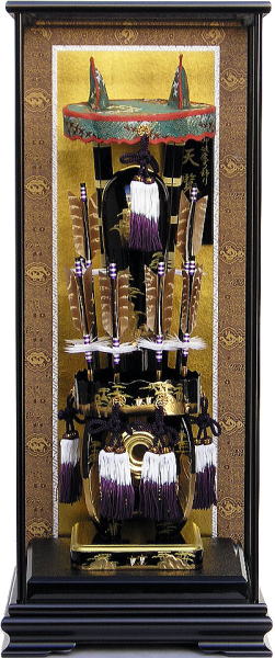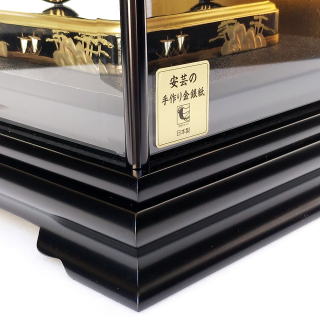 | 「寿々登」作、20号「展覧品」でございます。 艶を消し上品な黒色に塗り仕上げたケース木枠に、極限まで薄く打ち延ばした薄い金箔を和紙に職人が一枚一枚丁寧に手作業で箔押した安芸の手作り「金箔押し紙」を使用したケース背景を合わせた高級感漂う豪華なケースです。 温かみのある色合いが特徴の「雉」天然羽根を使用した8本の矢羽根は、「仁義八行」を意味し道徳を養うという意味を持ち仁徳を持った素晴らしい人に育って欲しいという願いが込められております。 江戸時代から関東地方で作られてきた空穂(うつぼ、矢を収納するもの)を中心としたデザインの破魔弓飾りは、古くからお子様の初正月・初節句のお祝い(魔除け)とされてきました。 伝統ある江戸破魔弓飾りを基にした作品で、昭和8年、昭和天皇の皇太子誕生に際しこの破魔弓飾りを購入頂いたことから「展覧品」と命名し、当時のままの基本デザインを継承して作り続けている工房「寿々登」の名品でございます。 飾り台にあしらわれた山水絵図の金彩蒔絵や美しく藤巻された木製弓、熟練した技法で本金箔を手作業で貼り仕上げた豪華な矢尻と的が特徴的で豪華です。。 ケースの背景に高級感漂う「金箔」押し紙を使用し製作された別注モデルです。 ※「金箔押し紙」とは、0.1〜0.4ミクロンまで打ち延ばした薄い箔で、作り上げるまでのほとんどの工程が手作業で行われ薄く打ち延ばす過程で箔一枚ごとに微妙な色・艶・表情が現れるのが特徴的です。この箔を和紙に職人が一枚一枚丁寧に箔押したものが手作り金箔押し紙となります。 ●こちらの商品の特典(サービス品) ・お子様のお名前を書き入れた立札 ・国内送料無料です。 (ガラスケースの海外への発送はできません) |