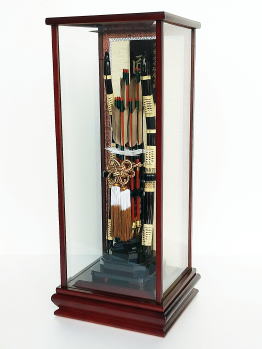| 「寿々登」作、六分之壱「匠」でございます。 艶を消し木目を活かした花梨塗り枠ケースです。上品な絵柄のヘリ付けたシンプルな背景が豪華な弓矢飾りを引き立てます。 落ち着きのある色合いの天然羽根を使用した7本の矢羽根には、七福神(恵比寿・大黒天・福禄寿・布袋・寿老人弁財天・毘沙門天)を表し、その加護を身につけ幸福な人生を送れますようにという招福の願いが込められております。 ケースと同色の花梨色に塗られた綺麗な矢と美しく藤巻された木製弓、熟練した技法で本金箔を手作業で貼り仕上げた豪華な矢尻が特徴的です。 工房「寿々登」ならではの洗練された上品なデザインと本金箔押しされた矢尻の輝きが美しい高級感漂います。 ケースの素材や形・色、弓矢飾りの配色を変更し製作された別注モデルの破魔弓飾りです。 ●こちらの商品の特典(サービス品) ・お子様のお名前を書き入れた立札 ・国内送料無料です。 (ガラスケースの海外への発送はできません) |