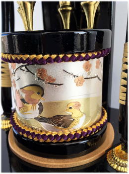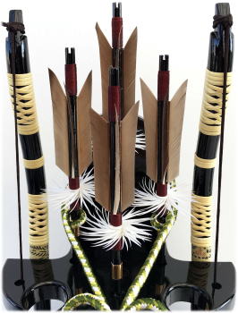 | 「寿々登」作、15号「誉」でございます。 艶を消した落ち着きのある伝統的な黒塗枠ケースです。上品な絵柄のヘリを付けたシンプルな背景が豪華な弓矢飾りを引き立てます。 落ち着きのある色彩の天然羽根を使用した4本の矢羽根には、「青龍」・「白虎」・「玄武」・「朱雀」の四神を示し、東西南北の魔を除ける方位除けの意味があります。 熟練した技法で本金箔を手作業で貼り仕上げた豪華な矢尻に、緑系色の組紐を使用した綺麗な飾り紐や吉祥文様として縁起の良い「梅」と「鴛鴦」を模った彫金細工をあしらった矢筒が特徴的です。 本金箔押しされた矢尻の輝きは格別で高級感漂う破魔弓飾りです。 ●こちらの商品の特典(サービス品) ・お子様のお名前を書き入れた立札 ・国内送料無料です。 (ガラスケースの海外への発送はできません) |